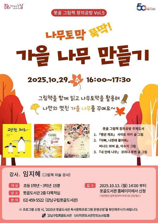 ÇÁ·Î±×·¥Àº 10¿ù 29ÀÏ ¼ö¿äÀÏ ¿ÀÈÄ 4½Ã¿¡ ¸ø°ñµµ¼°ü 2Ãþ ´Ù¸ñÀû½Ç¿¡¼ ÁøÇàÇϸç, ÃʵîÇб³ 1~3Çг⠾ÀÌ 15¸íÀ» ´ë»óÀ¸·Î ÇÑ´Ù. Á¢¼ö´Â 10¿ù 13ÀÏ ¿ù¿äÀÏ ¿ÀÈÄ 2½ÃºÎÅÍ ½ÃÀÛÇϸç ÀÚ¼¼ÇÑ »çÇ×Àº °³²±¸¸³¸ø°ñµµ¼°ü ȨÆäÀÌÁö(https://library.gangnam.go.kr/mglib)¸¦ Âü°íÇϰųª Àüȹ®ÀÇ(02-459-5522)¸¦ ÅëÇØ È®ÀÎÇÒ ¼ö ÀÖ´Ù. < ÀúÀÛ±ÇÀÚ © °³²½Å¹® ¹«´ÜÀüÀç ¹× Àç¹èÆ÷±ÝÁö >