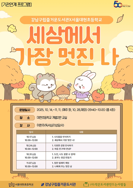 º» ÇÁ·Î±×·¥Àº ¼¿ï ´ëÇöÃʵîÇб³ Ư¼öÇбÞÀ» ´ë»óÀ¸·Î ÁøÇàµÇ´Â ÇÁ·Î±×·¥À¸·Î 10¿ù 14ÀÏ, 21ÀÏ, 11¿ù 4ÀÏ, 11ÀÏ È¿äÀÏ ¿ÀÀü 9½Ã 40ºÐºÎÅÍ 10½Ã 20ºÐ±îÁö 40ºÐ°£µ¿¾È ÃÑ 4ȸ¿¡ °ÉÃÄ ÁøÇàÇÒ ¿¹Á¤ÀÌ´Ù.