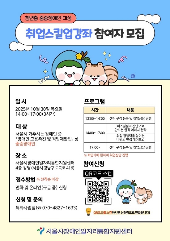 ¼¿ï½ÃÀå¾ÖÀÎÀÏÀÚ¸®ÅëÇÕÁö¿ø¼¾ÅÍ(¼¾ÅÍÀå ÀÌÀ籸)´Â ¿À´Â 13ÀϺÎÅÍ ¼¿ïƯº°½Ã °ÅÁÖ ÁßÁõÀå¾ÖÀÎÀ» ´ë»óÀ¸·Î Ãë¾÷½ºÅ³¾÷°Á 4ȸÂ÷ Âü¿©ÀÚ ¸ðÁýÀ» ½Ç½ÃÇÑ´Ù.