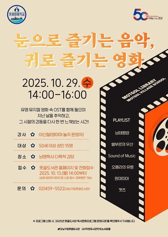 60¹øÂ°·Î ÁøÇàµÇ´Â º» ÇÁ·Î±×·¥Àº 50¼¼ ÀÌ»ó ¼ºÀÎÀ» ´ë»óÀ¸·Î ÁøÇàÇÑ´Ù. ‘¿µÈ’¸¦ ÁÖÁ¦·Î ‘³²ÅÂÆò¾ç’, ‘½©ºÎ¸£ÀÇ ¿ì»ê’, ‘Sound of Music’, ‘¿ÀÆä¶óÀÇ À¯·É’, ‘¸¾¸¶¹Ì¾Æ’, ‘ĹÃ÷’ ¹ÂÁöÄà ¿µÈ ¼Ó OST¸¦ °¨»óÇÏ¸é¼ Áö³³¯À» Ãß¾ïÇϰí, ±× ½ÃÀýÀÇ °¨µ¿À» ´Ù½Ã Çѹø ´À²¸º¸°íÀÚ ÇÑ´Ù. ´õºÒ¾î À½¾ÇÀ̶ó´Â ¸Å°³Ã¼¸¦ ÅëÇØ ºñ½ÁÇÑ ¿¬·É´ëÀÇ Áö¿ªÁÖ¹ÎÀÌ ÀλýÀÇ Èñ·Î¾Ö¶ôÀ» ÇÔ²² À̾߱âÇÏ¸ç ¼ÒÅëÇÒ ¼ö ÀÖ´Â ±âȸ¸¦ Á¦°øÇϰíÀÚ ÇÑ´Ù.