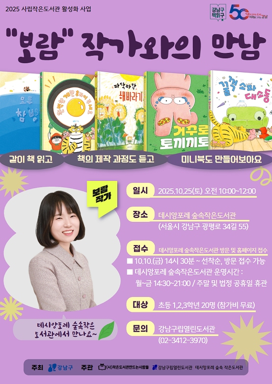 ¿À´Â 10¿ù 25ÀÏ Åä¿äÀÏ ¿ÀÀü 10½ÃºÎÅÍ µ¥½Ã¾ÓÆ÷·¹ ½£¼ÓÀÛÀºµµ¼°ü¿¡¼ ¿¸®´Â À̹ø ¸¸³²¿¡´Â <°Å²Ù·Î Åä³¢³¢Åä>ÀÇ ÀúÀÚ º¸¶÷ ÀÛ°¡°¡ Á÷Á¢ Âü¿©ÇÑ´Ù. º¸¶÷ ÀÛ°¡´Â <ÆÄ´ÚÆÄ´Ú ÇØ¹Ù¶ó±â>, <¸ðµÎ Âü¹æ>, <¿Ïº®ÇÑ °è¶õ ÈĶóÀÌ ÁÖ¼¼¿ä>, <°Å²Ù·Î Åä³¢³¢Åä>, <²Ü²© ¼ÒÆÄ ´ë¼Òµ¿> ÃÑ ´Ù¼¸ ±ÇÀÇ ±×¸²Ã¥ À̾߱⸦ ÅëÇØ ¾ÆÀ̵鿡°Ô µû¶æÇÑ ¸Þ½ÃÁö¸¦ ÀüÇÒ ¿¹Á¤ÀÌ´Ù.