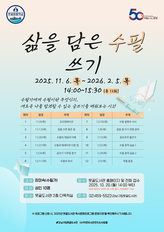 62¹øÂ°·Î ÁøÇàµÇ´Â º» ÇÁ·Î±×·¥Àº ¼ºÀÎÀ» ´ë»óÀ¸·Î ÁøÇàÇÑ´Ù. ‘¼öÇÊ’À» ÁÖÁ¦·Î ‘¼öÇÊ ÀÌ·Ð’, ‘¼öÇʰú ¿¡¼¼ÀÌ Â÷ÀÌÁ¡’, ‘¼ÒÀç ã´Â ¹ý’, ‘¼öÇÊ ¾²±â’ µî 12ȸÂ÷·Î ±¸¼ºµÆ´Ù. ¼öÇʰ¡ÀÎ °»ç¿¡°Ô ¼öÇÊÀ̶õ ¹«¾ùÀÎÁö, ÁÁÀº ÀÛǰÀ» °¨»óÇϸç ÀÛǰÀ» Àо´Â ¾È¸ñÀ» ¹è¿öº»´Ù. ´õºÒ¾î Àϻ󿡼 ±Û¾²±âÀÇ Áñ°Å¿òÀ» ã°í, ±Û¾²±â¸¦ ÅëÇØ ÀڽŠ¾È¿¡ ¼û°ÜÁø »õ·Î¿î ‘³ª’¸¦ ãÀ» ¼ö ÀÖµµ·Ï Áö¿øÇϰíÀÚ ÇÑ´Ù.