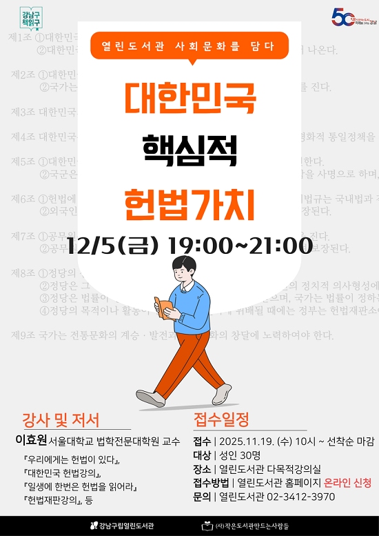 ÇÁ·Î±×·¥ ½ÅûÀº ¼ºÀÎ ´©±¸³ª 2025³â 11¿ù 19ÀÏ ¼ö¿äÀÏ ¿ÀÀü 10½ÃºÎÅÍ °³²±¸¸³¿¸°µµ¼°ü ȨÆäÀÌÁö¿¡¼ °¡´ÉÇÏ´Ù. ¼±Âø¼ø ¸¶°¨À̸ç, °ü·Ã ¼¼ºÎ ³»¿ëÀº °³²±¸¸³¿¸°µµ¼°ü ȨÆäÀÌÁö(https://library.gangnam.go.kr/yllib)¸¦ Âü°íÇϰųª ÀüÈ(02-3412-3970)·Î ¹®ÀÇÇÏ¸é µÈ´Ù. < ÀúÀÛ±ÇÀÚ © °³²½Å¹® ¹«´ÜÀüÀç ¹× Àç¹èÆ÷±ÝÁö >