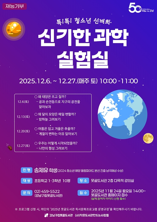 ‘Åå!Åå! û¼Ò³â ¼±¹èÀÇ ½Å±âÇÑ °úÇÐ ½ÇÇè½Ç’ ÇÁ·Î±×·¥Àº ÃʵîÇб³ 1~3Çг⠾ÀÌ 10¸íÀ» ´ë»óÀ¸·Î ÁøÇàÇÑ´Ù. ‘¿Ö žçÀº ¶ß°í Áú±î?’, ‘´ÞÀÇ ¸ð¾çÀº ¿Ö ¸ÅÀÏ º¯ÇÒ±î?’ µî ÀÏ»ó ¼Ó °úÇÐ ¿ø¸®¸¦ ½±°í Àç¹ÌÀÖ°Ô ¹è¿ï ¼ö ÀÖµµ·Ï ÇÏ´Â ½ÇÇè Á᫐ ÇÁ·Î±×·¥ÀÌ´Ù. û¼Ò³â ¼±¹è°¡ Á÷Á¢ ÁغñÇÑ ´Ù¾çÇÑ ½ÇÇè Ȱµ¿À» ÅëÇØ ¾î¸°À̵éÀÌ ¿ìÁÖ°úÇÐÀÇ ±âÃÊ ¿ø¸®¸¦ Èï¹Ì·Ó°Ô üµæÇÒ ¼ö ÀÖµµ·Ï ±¸¼ºµÆ´Ù.