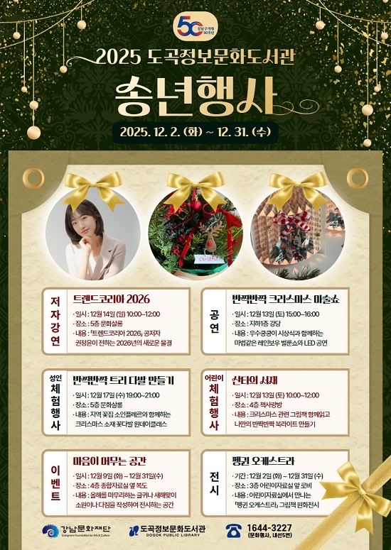 °³²¹®ÈÀç´Ü(ÀÌ»çÀå ±èÁ¾¼·)ÀÌ ¿î¿µÇÏ´Â µµ°îÁ¤º¸¹®Èµµ¼°üÀÌ ¿¬¸»À» ¸Â¾Æ ‘2025 ¼Û³âÇà»ç’¸¦ °³ÃÖÇÑ´Ù. À̹ø Çà»ç´Â µµ¼°ü ÀÌ¿ëÀÚ¿Í Áö¿ª ÁֹεéÀÌ ÇÑ ÇØ¸¦ ¸¶¹«¸®ÇÏ°í »õÇØ¸¦ ÁغñÇÒ ¼ö ÀÖµµ·Ï ¡ã°¿¬ ¡ã°ø¿¬ ¡ãüÇèÇà»ç ¡ãÀ̺¥Æ® ¡ãÀü½Ã µî ´Ù¾çÇÑ ÇÁ·Î±×·¥À» 12¿ù ÇÑ ´Þ°£ Á¦°øÇÑ´Ù.