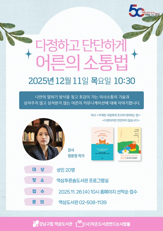 °³²±¸¸³ ¿ª»ïµµ¼°üÀº ¿À´Â 12¿ù 11ÀÏ(¸ñ), º£½ºÆ®¼¿·¯ ¡º´ÙÁ¤ÇÏÁö¸¸ ¸¸¸¸ÇÏÁö ¾Ê½À´Ï´Ù¡»·Î ¸¹Àº µ¶ÀÚµéÀÇ °ø°¨À» ¾ò°í ÀÖ´Â Á¤¹®Á¤ ÀÛ°¡¿Í ÇÔ²² ¼ºÀÎÀ» À§ÇÑ ¼ÒÅë Æ¯° ¡´´ÙÁ¤ÇÏ°í ´Ü´ÜÇϰÔ, ¾î¸¥ÀÇ ¼ÒÅë¹ý¡µÀ» ÁøÇàÇÑ´Ù. À̹ø ÇÁ·Î±×·¥Àº ÀÏ»ó ¼Ó¿¡¼ ÀÚ½ÅÀÇ °¨Á¤À» Ç¥ÇöÇÏ±â ¾î·Æ°Å³ª °ü°è¿¡¼ ±ÕÇü ÀÖ´Â ¼ÒÅë ¹æ½ÄÀ» ã±â ¾î·Á¿î ¼ºÀÎÀ» ´ë»óÀ¸·Î ¸¶·ÃµÇ¾ú´Ù.