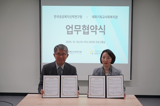 ÅÂȱ⵶±³»çȸº¹Áö°ü(°üÀå À̾ÆÁø, ÀÌÇÏ ‘ÅÂÈ’)Àº 2025³â 12¿ù 10ÀÏ(¼ö) 15½Ã, º»°ü 305È£ ÇÁ·Î±×·¥½Ç¿¡¼ Çѱ¹°ø°øº¹Áö½ÅŹ¿¬±¸¿ø(ÀÌ»çÀå ±ÇÁ¾È£, ÀÌÇÏ ‘°ø°øº¹Áö½ÅŹ’)°ú °ø°øº¹Áö½ÅŹ º¸±Þ ¹× Àü¹® ±³À° Çù·ÂÀ» À§ÇÑ ¾÷¹«Çù¾à(MOU)À» ü°áÇÏ¿´´Ù.