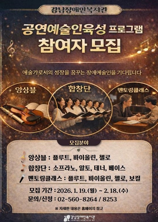 °³²Àå¾ÖÀκ¹Áö°ü(°üÀå ÀºÀ±ÅÂ)Àº °ø¿¬¿¹¼ú ºÐ¾ß¿¡¼ Ȱµ¿ °¡´É¼ºÀ» Áö´Ñ Àå¾Ö¿¹¼úÀÎÀ» ¹ß±¼Çϰí, ÇÕâ´Ü·¾Ó»óºí ´Ü¿ø ¼±¹ß ¹× ¸àÅ丵Ŭ·¡½º¸¦ ÅëÇÑ ´Ü°èÀû À°¼ºÀ» À§ÇØ ¿À´Â 2¿ù 18ÀϱîÁö Âü¿©ÀÚ¸¦ ¸ðÁý, ¡¸2026 °ø¿¬¿¹¼úÀι߱¼ ¿Àµð¼Ç¡¹À» ÁøÇàÇÑ´Ù.