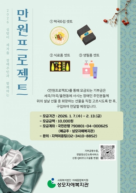¼³ ¸íÀýÀ» ¾ÕµÎ°í °³²±¸ ¼¼°îµ¿·Àڰ·À²Çöµ¿ ÁÖ¹ÎÀÌ °°Àº Áö¿ª¿¡ »ç´Â Àå¾Ö ÀÌ¿ôÀ» À§ÇØ ¶æÀ» ¸ð¾Ò´Ù. ¼º¸ðÀÚ¾Öº¹Áö°üÀº 1¿ù 7ÀϺÎÅÍ 2¿ù 13ÀϱîÁö ¿Â¶óÀÎÀ» ÅëÇØ ‘¼³¸ÂÀÌ ¼¼ÀÚÀ² Àå¾ÖÁֹΰú ÇÔ²²ÇÏ´Â ¸¸¿ø ÇÁ·ÎÁ§Æ®’ ¸ð±ÝÀ» ÁøÇàÇÑ´Ù°í ¹àÇû´Ù.