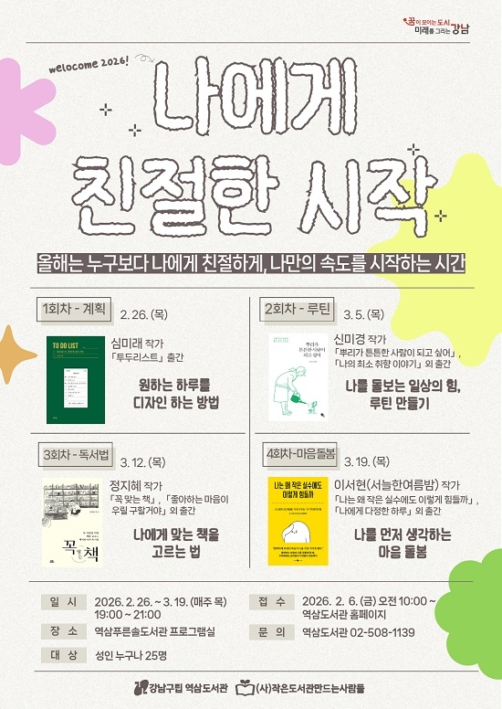 °³²±¸¸³¿ª»ïµµ¼°üÀº 2026³â »õÇØ¸¦ ¸Â¾Æ ¼ºÀÎÀ» ´ë»óÀ¸·Î <³ª¿¡°Ô Ä£ÀýÇÑ ½ÃÀÛ> ÇÁ·Î±×·¥À» ¿î¿µÇÑ´Ù. À̹ø ÇÁ·Î±×·¥Àº »õÇØÀÇ ½ÃÀÛ°ú ÇÔ²² ¹«Á¶°ÇÀûÀÎ ¼ºÃ븦 ¸ñÇ¥·Î Çϱ⺸´Ù, ³ª ÀÚ½ÅÀ» ¸ÕÀú »ìÇÇ°í º¸µë´Â ¹ýÀ» ¹è¿ï ¼ö ÀÖµµ·Ï µ½°íÀÚ ±âȹµÇ¾ú´Ù. ÇÁ·Î±×·¥Àº 2¿ù 26ÀÏ(¸ñ)ºÎÅÍ 3¿ù 19ÀÏ(¸ñ)±îÁö ¸ÅÁÖ ¸ñ¿äÀÏ Àú³á 7½ÃºÎÅÍ 9½Ã±îÁö ÃÑ 4ȸ¿¡ °ÉÃÄ ÁøÇàµÈ´Ù.