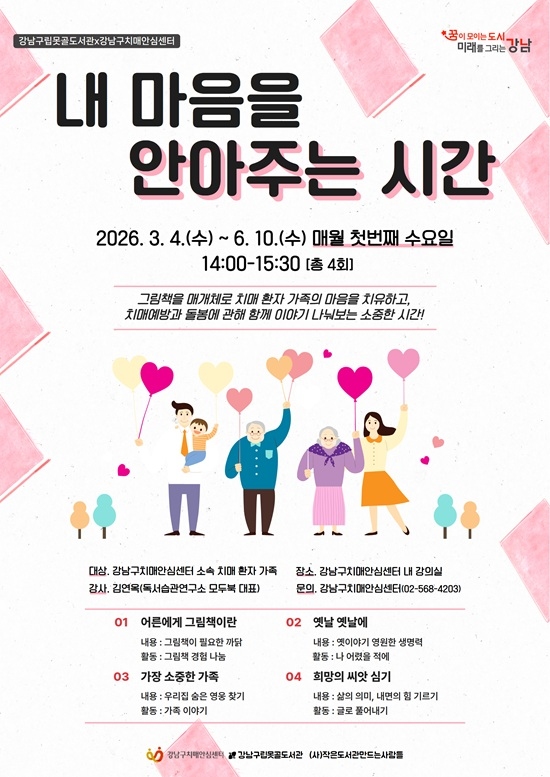 °³²±¸Ä¡¸Å¾È½É¼¾ÅÍ ¼Ò¼Ó Ä¡¸Å ȯÀÚ °¡Á·À» ´ë»óÀ¸·Î Çϸç, 3¿ùºÎÅÍ 6¿ù±îÁö ¸Å¿ù ù ¹øÂ° ¼ö¿äÀÏ¿¡ ±×¸²Ã¥À» ¸Å°³Ã¼·Î µ¶¼¸ðÀÓÀ» ÁøÇàÇÑ´Ù. ÇÁ·Î±×·¥Àº ‘¾î¸¥¿¡°Ô ±×¸²Ã¥À̶õ’, ‘¿¾³¯ ¿¾³¯¿¡’, ‘°¡Àå ¼ÒÁßÇÑ °¡Á·’, ‘Èñ¸ÁÀÇ ¾¾¾Ñ ½É±â’ 4°¡Áö ÁÖÁ¦·Î ±¸¼ºµÇ¾ú´Ù. ¸Åȸ ÁÖÁ¦º° ±×¸²Ã¥À» ÇÔ²² Àаí À̾߱⸦ ³ª´« ÈÄ °ü·Ã µ¶ÈÄ È°µ¿À» º´ÇàÇϸç, À̸¦ ÅëÇØ Ä¡¸Å µ¹º½À¸·Î ÁöÄ£ °¡Á·µéÀÌ ½É¸®Àû À§¾ÈÀ» ¾ò°í ¸¶À½À» Ä¡À¯ÇÒ ¼ö ÀÖµµ·Ï Áö¿øÇÒ ¿¹Á¤ÀÌ´Ù.