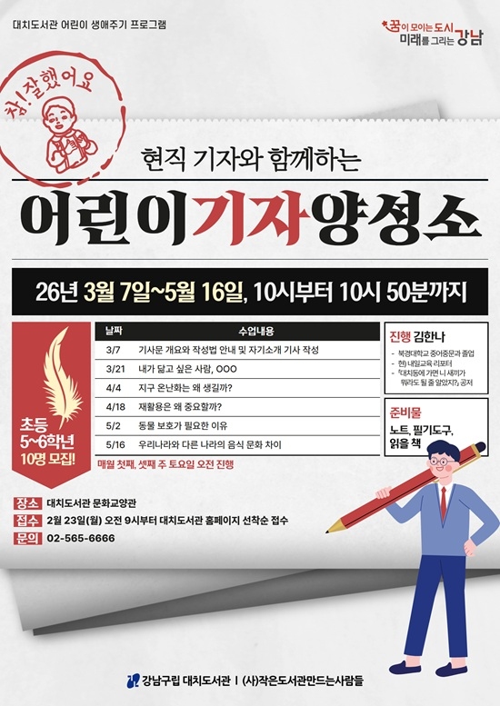 '¾î¸°ÀÌ ±âÀÚ ¾ç¼º¼Ò'´Â 2024³âºÎÅÍ ¸¹Àº °ü½ÉÀ» ¹Þ¾Æ¿Â ÇÁ·Î±×·¥À¸·Î 3¿ùºÎÅÍ 5¿ù±îÁö ¸Å¿ù 1, 3ÁÖ Åä¿äÀÏ¿¡ ¿î¿µµÈ´Ù. Àü¹®°¡¿¡°Ô ±â»ç¹®ÀÇ Àü¹ÝÀûÀÎ °³¿ä¿Í ÀÛ¼º¹ýÀ» ¹è¿ì°í ȸÂ÷º°·Î Á¤ÇØÁø ÀÏ»óÀÇ ¼ÒÀ縦 Ȱ¿ëÇØ ±â»ç¸¦ ¿Ï¼ºÇÔÀ¸·Î½á âÀÛÀÇ Áñ°Å¿òÀ» ´À³¥ ¼ö ÀÖ´Â À¯ÀÍÇÑ ½Ã°£ÀÌ µÉ °ÍÀ¸·Î ±â´ëÇÑ´Ù.