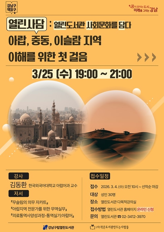 °³²±¸¸³¿¸°µµ¼°üÀÌ ¿À´Â 3¿ù 25ÀÏ ‘¿¸°»ç´ã :¾Æ¶ø, Áßµ¿, À̽½¶÷ Áö¿ª ÀÌÇØ¸¦ À§ÇÑ Ã¹ °ÉÀ½’ ÇÁ·Î±×·¥À» ¿î¿µÇÑ´Ù. ‘¿¸°»ç´ã’Àº ‘¿¸°µµ¼°ü, »çȸ¹®È¸¦ ´ã´Ù’ÀÇ ÁÙÀÓ¸»·Î, »çȸ°úÇÐ ºÐ¾ß Æ¯È µµ¼°üÀÎ ¿¸°µµ¼°üÀÌ Çö´ë »çȸ¿¡¼ À̽´ µÇ°í ÀÖ´Â ´Ù¾çÇÑ »çȸÀû Çö»óÀ» Àü¹® °»ç¿Í ÇÔ²² »ìÆìº¸´Â Ư° ÇÁ·Î±×·¥ÀÌ´Ù. À̹ø °¿¬¿¡¼´Â ‘¾Æ¶ø’À» ±íÀÌ ÀÖ°Ô ´Ù·é´Ù.