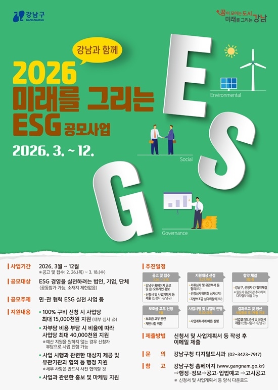 ½ÅûÀº ±¸Ã» ȨÆäÀÌÁö¿¡¼ ½Åû¼¸¦ ³»·Á¹Þ¾Æ ÀÛ¼º ÈÄ °ü·Ã ¼·ù¿Í ÇÔ²² À̸ÞÀÏ(eun0310@gangnam.go.kr)·Î Á¦ÃâÇÏ¸é µÈ´Ù. Á¢¼ö ¸¶°¨Àº 3¿ù 18ÀÏÀ̸ç, ½ÇÇö °¡´É¼º°ú Áö¼Ó°¡´É¼º, »çȸÀû ÆÄ±ÞÈ¿°ú µîÀ» ½É»çÇØ 3¿ù Áß °á°ú¸¦ ¹ßÇ¥ÇÒ ¿¹Á¤ÀÌ´Ù. ÀÚ¼¼ÇÑ ³»¿ëÀº ±¸Ã» ȨÆäÀÌÁö °ø°í¹®¿¡¼ È®ÀÎÇÒ ¼ö ÀÖ´Ù.