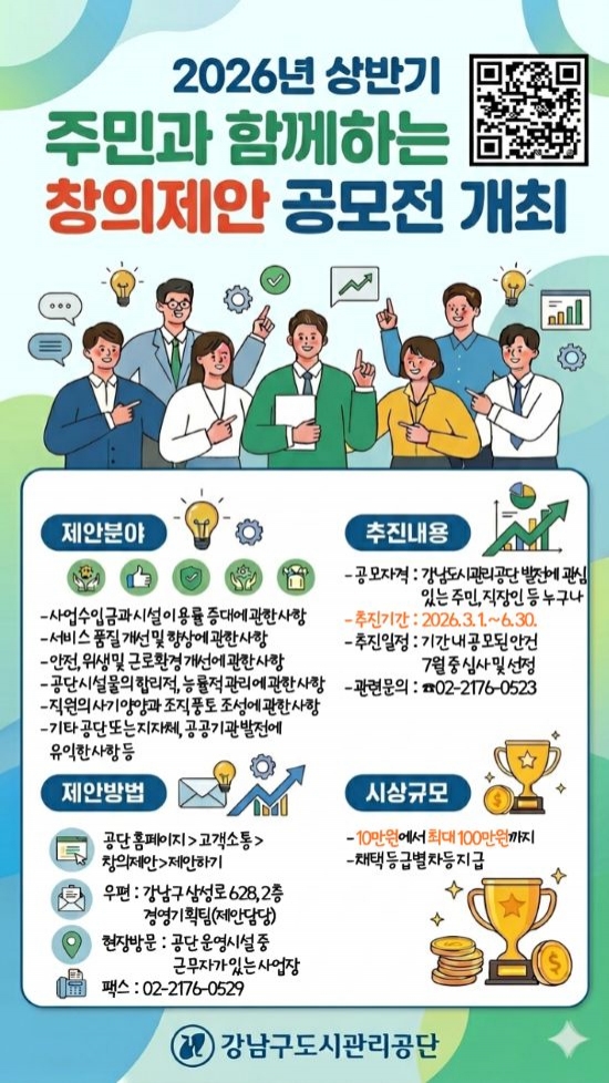 °ø¸ð ±â°£Àº 2026³â 3¿ù 1ÀϺÎÅÍ 6¿ù 30ÀϱîÁöÀ̸ç, °ø´Ü ¹ßÀü¿¡ °ü½É ÀÖ´Â ÁÖ¹Î, Á÷ÀåÀÎ µî ´©±¸³ª Âü¿©ÇÒ ¼ö ÀÖ´Ù. Á¦¾È ºÐ¾ß´Â ¿î¿µ ½Ã¼³¹°°ú °ø´Ü ¿î¿µ Àü¹Ý¿¡ ´ëÇÑ ÀǰßÀ» ÀÚÀ¯·Ó°Ô Á¦¾ÈÇÒ ¼ö ÀÖÀ¸¸ç, Á¢¼öµÈ Á¦¾ÈÀº ³»ºÎ °ËÅä¿Í ½É»ç¸¦ °ÅÃÄ 7¿ù Áß ¿ì¼ö Á¦¾ÈÀ» ¼±Á¤ÇÒ °èȹÀÌ´Ù.