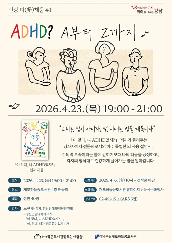 °¿¬Àº 4¿ù 23ÀÏ ¸ñ¿äÀÏ ¿ÀÈÄ 7½Ã¿¡ °³Æ÷Çϴò޵µ¼°ü 4Ãþ ¹è¿òÅÍ¿¡¼ ÁøÇàµÇ¸ç, ¼ºÀÎ 40¸íÀ» ´ë»óÀ¸·Î ÇÑ´Ù. ÀÚ¼¼ÇÑ »çÇ×Àº °³²±¸¸³°³Æ÷Çϴò޵µ¼°ü ȨÆäÀÌÁö (https://library.gangnam.go.kr/hnkklib/index.do)¸¦ Âü°íÇϰųª Àüȹ®ÀÇ(02-451-1511)¸¦ ÅëÇØ È®ÀÎ ÇÒ ¼ö ÀÖ´Ù. < ÀúÀÛ±ÇÀÚ © °³²½Å¹® ¹«´ÜÀüÀç ¹× Àç¹èÆ÷±ÝÁö >