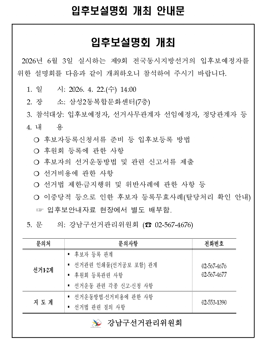 ¼³¸íȸ¿¡¼´Â Èĺ¸ÀÚ µî·Ï ½Åû¼·ù Áغñ ¹æ¹ýÀ» ºñ·ÔÇØ ÈÄ¿øÈ¸ µî·Ï, ¼±°Å¿îµ¿ ¹æ¹ý ¹× ½Å°í ÀýÂ÷, ¼±°Åºñ¿ë °ü·Ã »çÇ× µîÀÌ ¾È³»µÉ ¿¹Á¤ÀÌ´Ù. ¶ÇÇÑ ¼±°Å¹ý»ó Á¦ÇÑ·±ÝÁöÇàÀ§¿Í À§¹Ý »ç·Ê, ÀÌÁß´çÀû¿¡ µû¸¥ Èĺ¸ÀÚ µî·Ï ¹«È¿ »ç·Ê µîµµ ÇÔ²² ¼³¸íµÈ´Ù.