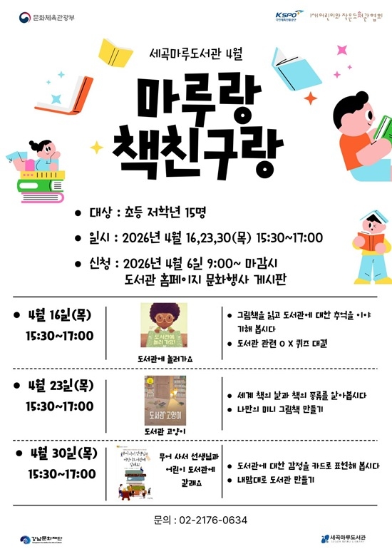 ¼¼°î¸¶·çµµ¼°ü¿¡¼´Â ¼ºÀΰú ¾î¸°À̸¦ ´ë»óÀ¸·Î ÇÑ µÎ °³ÀÇ µ¶¼¹®È ÇÁ·Î±×·¥ÀÌ ¿î¿µµÉ ¿¹Á¤ÀÌ´Ù. ¼ºÀÎ ´ë»ó '±×¸²Ã¥ ÇÇ´Â ¼ö¿äÀÏ'Àº ±×¸²Ã¥À» ¸Å°³·Î Âü°¡ÀÚ °¢ÀÚÀÇ °¨Á¤°ú °æÇèÀ» ÀÚÀ¯·Ó°Ô ³ª´©´Â µ¿¾Æ¸® ¼º°ÝÀÇ ¸ðÀÓÀ¸·Î, ¸Å¿ù ¸¶Áö¸· ¼ö¿äÀÏ¿¡ Á¤±âÀûÀ¸·Î ¿î¿µµÈ´Ù. ¾î¸°ÀÌ ´ë»ó '¸¶·ç¶û å챏¶û'Àº ÁÖÁ¦ ±×¸²Ã¥ Àб⸦ Áß½ÉÀ¸·Î ¹Ì´ÏºÏ ¸¸µé±â, ³ë·¡ ºÎ¸£±â µî ´Ù¾çÇÑ ¿¬°èȰµ¿À» ÁøÇàÇϸç, ¸ÅÁÖ ±Ý¿äÀÏ¿¡ ¿î¿µµÈ´Ù.