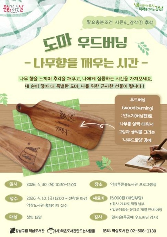 <ÇÊ¿äÃæºÐÁ¶°Ç ½ÃÁð4_°¨°¢¨ç Èİ¢> ÇÁ·Î±×·¥Àº ¿ìµå¹ö´× ¸ñ°ø¿¹ °»ç¿Í ÇÔ²² ¿À» °¡ÇÑ ÆæÀ¸·Î ³ª¹«¿¡ ¹®¾çÀ̳ª ¹®±¸¸¦ »õ±â´Â ¿ìµå¹ö´× °ø¿¹¸¦ °æÇèÇØ º¸´Â üÇèÇü °ÁÂÀÌ´Ù. Âü¿©ÀÚµéÀº ÀÛ¾÷ °úÁ¤¿¡¼ ³ª¹« °íÀ¯ÀÇ Çâ°ú ÀºÀºÇÏ°Ô Å¸¿À¸£´Â ³¿»õ¸¦ ÀÚ¿¬½º·´°Ô Á¢Çϸç, ½Ã°¢ Áß½ÉÀÇ Àϻ󿡼 ¹þ¾î³ª Èİ¢¿¡ ÁýÁßÇÏ´Â ½Ã°£À» °®°Ô µÈ´Ù.