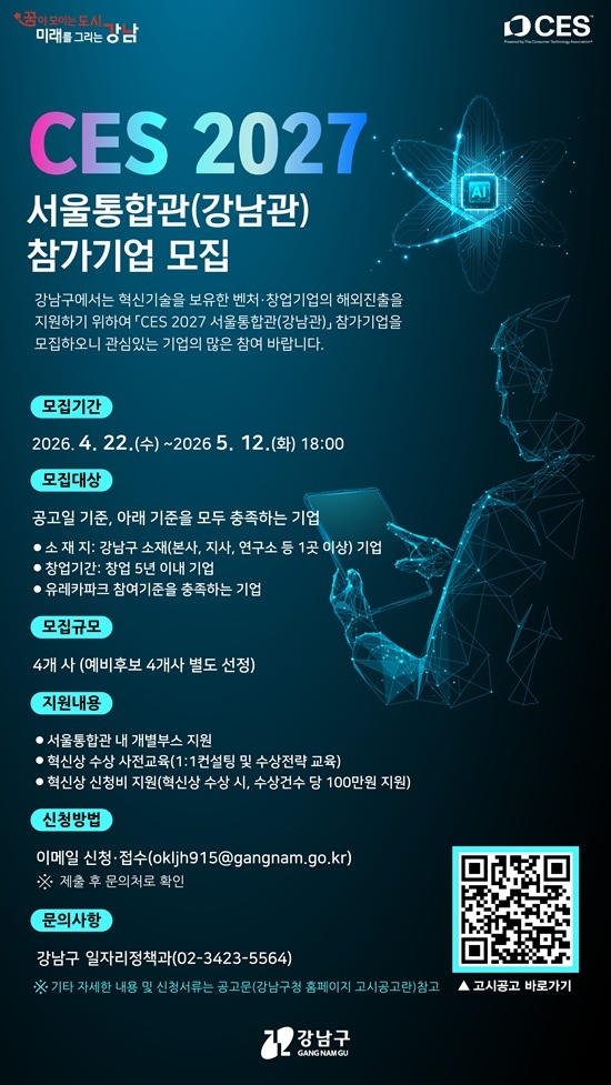 °³²±¸(±¸Ã»Àå Á¶¼º¸í)°¡ ¼¼°è ÃÖ´ë IT·ÀüÀÚ Àü½ÃȸÀÎ CES 2027À» ¹«´ë·Î °ü³» ½ºÅ¸Æ®¾÷ÀÇ ±Û·Î¹ú ÁøÃâ Áö¿ø¿¡ ³ª¼±´Ù. °³²±¸´Â ‘CES 2027 ¼¿ïÅëÇÕ°ü(°³²°ü)’¿¡ Âü¿©ÇÒ ½ºÅ¸Æ®¾÷À» 4¿ù 22ÀϺÎÅÍ 5¿ù 12ÀϱîÁö ¸ðÁýÇÑ´Ù.