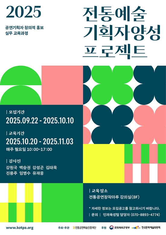 ÀüÅë°ø¿¬¿¹¼úÁøÈïÀç´Ü(ÀÌ»çÀå ¹è¿µÈ£)ÀÌ ÀüÅë°ø¿¬¿¹¼ú ºÐ¾ßÀÇ Àü¹® ±âȹÀÚ¸¦ ¾ç¼ºÇϱâ À§ÇÑ ‘2025 ÀüÅ뿹¼ú ±âȹÀÚ ¾ç¼º ÇÁ·ÎÁ§Æ®’ ÇϹݱâ ÇÁ·Î±×·¥ Âü°¡ÀÚ¸¦ 9¿ù 22ÀϺÎÅÍ 10¿ù 10ÀϱîÁö ¸ðÁýÇÑ´Ù.