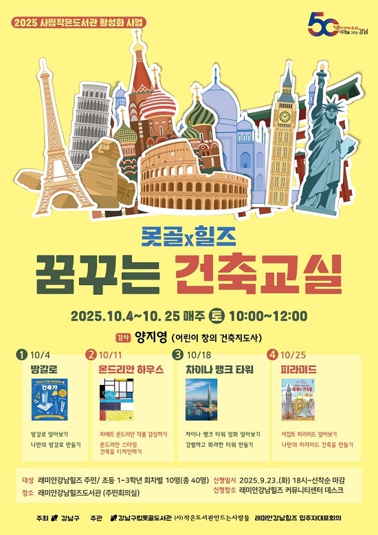 ‘²Þ²Ù´Â °ÇÃà±³½Ç’Àº ·¡¹Ì¾È°³²ÈúÁî ¾ÆÆÄÆ® ³» ÃʵîÇб³ 1~3ÇгâÀ» ´ë»óÀ¸·Î °¢ Â÷½Ã´ç 10¸íÀ» ¸ðÁýÇÑ´Ù. °¿¬Àº ‘¹æ°¥·Î’, ‘¸óµå¸®¾È ÇϿ콺’, ‘Â÷À̳ª ¹ðÅ© Ÿ¿ö’, ‘ÇǶó¹Ìµå’ µî ¼¼°è ´Ù¾çÇÑ ·£µå¸¶Å© °ÇÃ๰À» ÁÖÁ¦·Î °ÇÃà ¿ø¸®¿Í Ư¡À» ¹è¿î ÈÄ Á÷Á¢ ¸ðÇüÀ» ¸¸µå´Â Ã¼ÇøÇü ÇÁ·Î±×·¥ÀÌ´Ù.