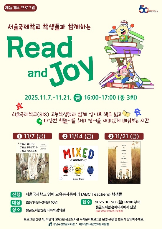 Read & Joy ÇÁ·Î±×·¥Àº ¼¿ï±¹Á¦Çб³ ¿µ¾î ±³À° ºÀ»çµ¿¾Æ¸® ABC TeachersÀÇ ÇлýµéÀÌ Á÷Á¢ ÁøÇàÇÏ´Â Çлý ÁÖµµÇü ¿µ¾î µ¶¼ ÇÁ·Î±×·¥ÀÌ´Ù. º» ÇÁ·Î±×·¥Àº û¼Ò³âµéÀÇ Àç´É±âºÎ¸¦ ÅëÇØ Áö¿ªÀÇ ¾î¸°À̵鿡°Ô ¿µ¾îÃ¥À» ¸Å°³·Î ÇÑ Áñ°Å¿î µ¶¼ °æÇè°ú ÀÚ¿¬½º·¯¿î ¿µ¾î ÇнÀÀÇ ±âȸ¸¦ Á¦°øÇϱâ À§ÇØ ±âȹµÇ¾ú´Ù.