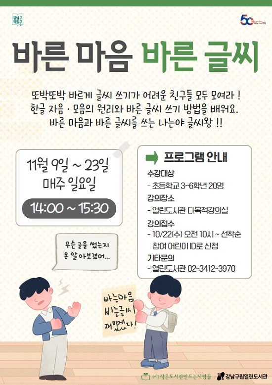 ‘¹Ù¸¥ ¸¶À½ ¹Ù¸¥ ±Û¾¾’´Â °úÇÐÀûÀÎ ±Û¾¾ ±³Á¤¹ýÀ» ÀÍÇô ¾ÇÇÊ¿¡¼ ¹þ¾î³ªµµ·Ï Áö¿øÇÏ´Â ³»¿ëÀ¸·Î ±¸¼ºµÇ¾ú´Ù. Âü¿©ÇÏ´Â ¾î¸°À̵éÀÌ ÇÑ±Û ±¸Á¶¿¡ ´ëÇÑ Á¤È®ÇÑ ÀÌÇØ¿Í ¾ÇÇÊ ¾²±âÀÇ ¿øÀÎÀ» ºÐ¼®ÇÏ°í ¿Ã¹Ù¸¥ ÀÚÀ½°ú ¸ðÀ½ÀÇ Á¶¸³ ¹æ¹ýÀ» ¾Ë°í ¹®ÀåÀ» ¸¸µé¾î ¾ÇÇÊÀ» Å»ÃâÇϴµ¥ ±â¿©ÇÑ´Ù.