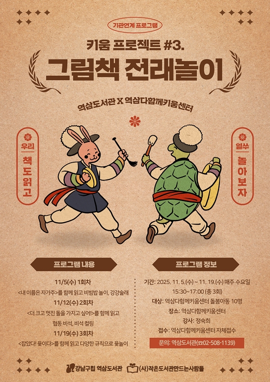 °³²±¸¸³¿ª»ïµµ¼°üÀº 11¿ù 5ÀÏ(¼ö)ºÎÅÍ 11¿ù 19ÀÏ(¼ö)±îÁö ¸ÅÁÖ ¼ö¿äÀÏ ÃÑ 3ȸ¿¡ °ÉÃÄ ¿ª»ï´ÙÇÔ²²Å°¿ò¼¾ÅÍ¿¡¼ ÀüÅ빮ȸ¦ ´ãÀº ±×¸²Ã¥À» Àаí ÀüÅë³îÀÌ Ã¼ÇèȰµ¿À» ÇÏ´Â ¾î¸°ÀÌ ÇÁ·Î±×·¥ <Ű¿ò ÇÁ·ÎÁ§Æ® #3. ±×¸²Ã¥ Àü·¡³îÀÌ>¸¦ ÁøÇàÇÑ´Ù.