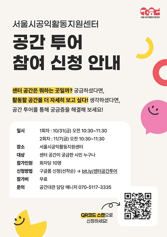 ¶ÇÇÑ ½Ã¹ÎµéÀÇ ¼¾ÅÍ °ø°£ ÀÌÇØ¸¦ µ½´Â ‘°ø°£ Åõ¾î’ ÇÁ·Î±×·¥ÀÌ Áö³ 10¿ùºÎÅÍ ¿î¿µ ÁßÀÌ´Ù. Åõ¾î¿¡¼´Â °øÀÍȰµ¿ °ø°£ÀÌ ¾î¶»°Ô ±¸¼ºµÇ°í Ȱ¿ëµÇ´ÂÁö¸¦ Á÷Á¢ µÑ·¯º¸¸ç, °¢ °ø°£ÀÇ ¿î¿µ ÃëÁö¿Í ½ÇÁ¦ Ȱ¿ë »ç·Ê¸¦ ÅëÇØ ¼¾ÅͰ¡ °øÀÍȰµ¿À» ¾î¶»°Ô Áö¿øÇÏ´ÂÁö »ìÆìº¼ ¼ö ÀÖ´Ù. 11¿ù 7ÀÏ ÁøÇàµÇ´Â °ø°£ Åõ¾î Âü¿©¸¦ Èñ¸ÁÇÏ´Â ½Ã¹ÎÀº ¼¿ï½Ã°øÀÍȰµ¿Áö¿ø¼¾ÅÍ È¨ÆäÀÌÁö¸¦ ÅëÇØ ½ÅûÇÒ ¼ö ÀÖ´Ù.