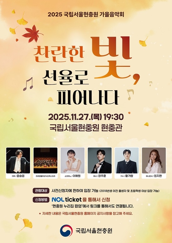±¹¸³¼¿ïÇöÃæ¿ø(¿øÀå À±ÇöÁÖ)Àº 11¿ù 27ÀÏ(¸ñ), "Âù¶õÇÑ ºû, ¼±À²·Î ÇǾ´Ù"¸¦ ÁÖÁ¦·Î °¡À»À½¾Çȸ¸¦ °³ÃÖÇÑ´Ù°í ¹àÇû´Ù. °ø¿¬Àº ±¹¸³¼¿ïÇöÃæ¿ø ÇöÃæ°ü¿¡¼ ÁøÇàµÇ¸ç, ¿ÀÈÄ 7½Ã 30ºÐºÎÅÍ ½ÃÀ۵ȴÙ.