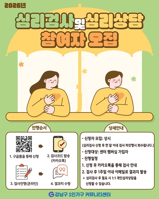 °³²±¸ 1Àΰ¡±¸ Ä¿¹Â´ÏƼ¼¾ÅÍ(ÀÌÇÏ ¼¾ÅÍ)°¡ °³²±¸ 1Àΰ¡±¸ÀÇ ½É¸®Àû ¾ÈÁ¤°ú Àڱ⵹º½À» µ½±â À§ÇØ ‘2026³â ½É¸®°Ë»ç ¹× ½É¸®»ó´ã Áö¿ø’ Âü¿©ÀÚ¸¦ ¸ðÁýÇÑ´Ù.