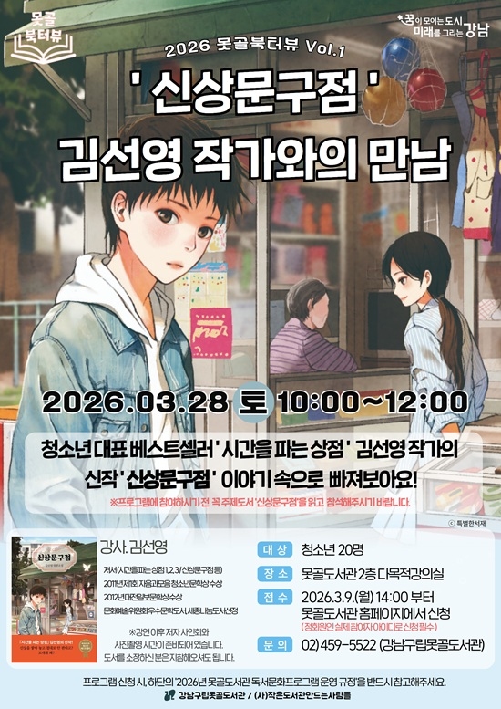 ÇØ´ç ÇÁ·Î±×·¥Àº 3¿ù 9ÀÏ(¿ù) ¿ÀÈÄ 2½ÃºÎÅÍ °³²±¸¸³¸ø°ñµµ¼°ü ȨÆäÀÌÁö¿¡¼ Á÷Á¢ ½ÅûÇÒ ¼ö ÀÖ´Ù. ÇÁ·Î±×·¥ °ü·Ã ÀÚ¼¼ÇÑ »çÇ×Àº °³²±¸¸³¸ø°ñµµ¼°ü ȨÆäÀÌÁö(https://library.gangnam.go.kr/mglib)¸¦ Âü°íÇϰųª Àüȹ®ÀÇ(02-459-5522)¸¦ ÅëÇØ È®ÀÎÇÒ ¼ö ÀÖ´Ù. < ÀúÀÛ±ÇÀÚ © °³²½Å¹® ¹«´ÜÀüÀç ¹× Àç¹èÆ÷±ÝÁö >