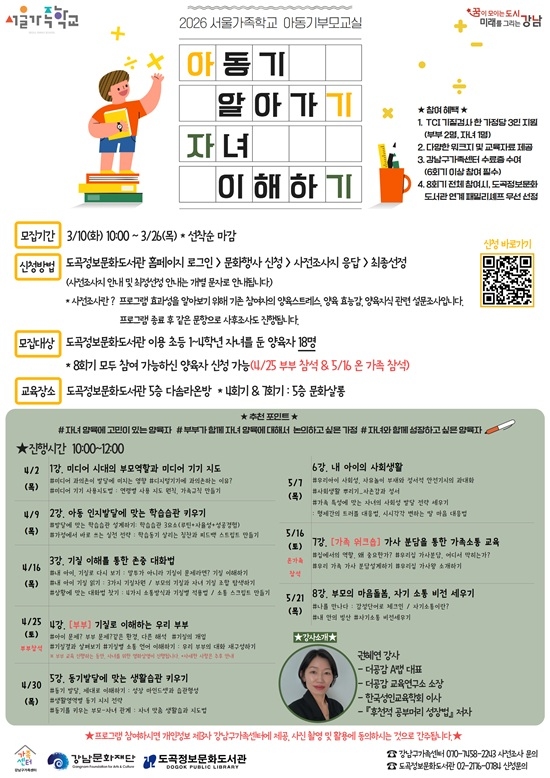µµ°îÁ¤º¸¹®Èµµ¼°üÀº ¿À´Â 4¿ù 2ÀÏ(¸ñ)ºÎÅÍ 5¿ù 21ÀÏ(¸ñ)±îÁö ÃÑ 8ȸ¿¡ °ÉÃÄ ¾Æµ¿±â ºÎ¸ð±³½Ç ‘¾Æ±â, ÀÚ±â(¾Æµ¿±â ¾Ë¾Æ°¡±â, ÀÚ³à ÀÌÇØÇϱâ)’¸¦ ¿î¿µÇÑ´Ù°í ¹àÇû´Ù. À̹ø ÇÁ·Î±×·¥Àº ÃʵîÇб³ 1~4Çгâ Àڳฦ µÐ ¾çÀ°ÀÚµéÀÌ ¾Æµ¿±â ¹ß´Þ Ư¼ºÀ» ÀÌÇØÇϰí, ½ÇÁúÀûÀÎ ¾çÀ° ±â¼úÀ» ½ÀµæÇØ °Ç°ÇÑ °¡Á¤È¯°æÀ» Á¶¼ºÇÒ ¼ö ÀÖµµ·Ï ±âȹµÇ¾ú´Ù.